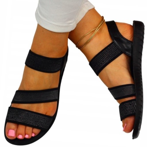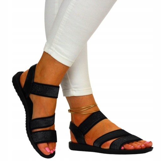 Damskie sandałki w kolorze czarnym na płaskim spodzie. Idealnie sprawdzą się jako obuwie na co dzień w letnie, upalne dni. Prosty fason dopasuje się również do eleganckich stylizacji. Elastyczny pasek przy pięcie ułatwia zakładanie obuwia i ułatwia jego dopasowanie różnych tęgości stopy.