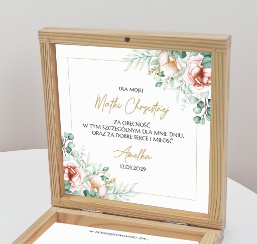 - we wnętrzu pudełka znajduje kolorowy nadruk w kwiecisty wzór, możliwość personalizacji - DEDYKACJA (dla kogo), IMIĘ I DATA
