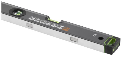Solidna poziomnica do prac wymagających wyższej dokładności. Odporny na skręcanie profil aluminiowy 24x50 mm (710 g/m) z płasko frezowanym spodem o maksymalnej płaskości. Duża cylindryczna libella ze szkłem powiększającym zapewnia precyzyjny i łatwy odczyt przy patrzeniu pod dowolnym kątem. Podwójne podziałki ułatwiają odczyt spadku 2%. Wykonana z udaroodpornych materiałów o bardzo dobrej odporności na promieniowanie UV. Promień libelli 200 mm zapewnia czułość 10 mm/m, tzn. po podniesieniu o 10 mm jednego końca poziomnicy o długości 1 m pęcherzyk przemieści się o 2 mm. Końcówki amortyzujące mają punkty o zwiększonym tarciu, umożliwiające pewne przyłożenie poziomnicy do płaszczyzny ściany. Wbudowane magnesy od spodu zapewniają przywieranie do konstrukcji stalowych. Otwory przelotowe do zamocowania zabezpieczenia narzędzia.