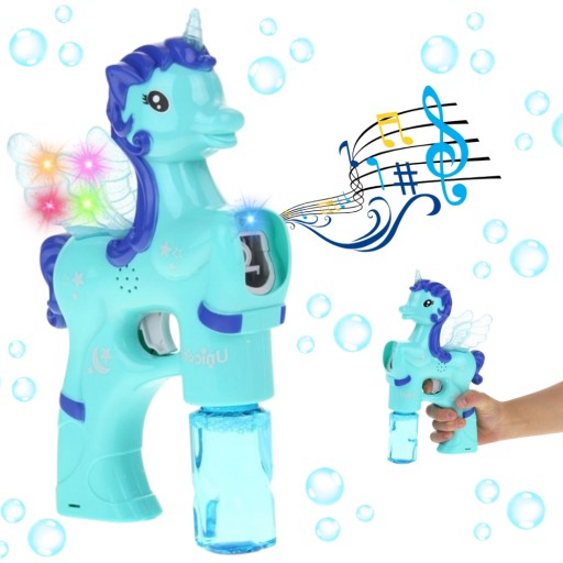 PISTOLET - APARAT do tworzenia baniek JEDNOROŻEC z funkcją światła oraz dwoma wkręcanymi płynami. Pistolet automatyczny - działa na baterie. Konik z podświetleniem LED i wesołą MUZYKĄ.