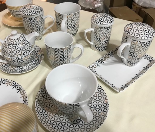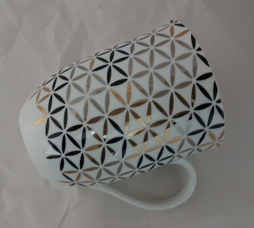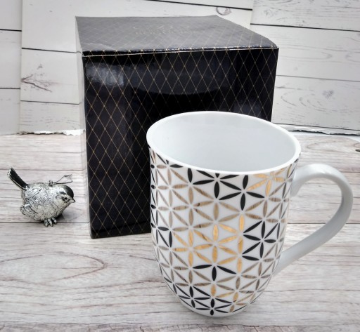 Kubek zdobione prostym, jednolitym wzorem, który ciekawie wkomponowuje się w każde wnętrza. Dynamiki dekoracji nadaje zastosowanie dwóch kolorów: złota oraz czerni rozmieszczonej w różnych, przypadkowych miejscach. Kubek wyprodukowany został w Polsce przez Porcelanę Bogucice. Dekoracja znajduje się na całej powierzchni kubka.