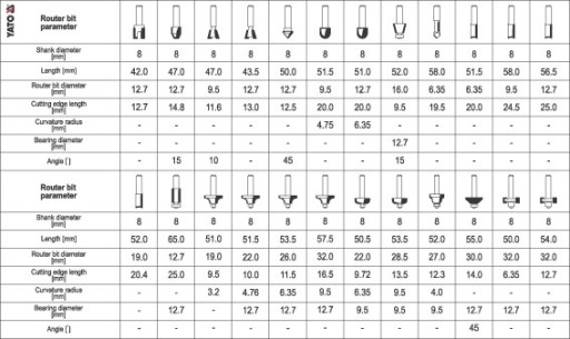 Precyzyjnie wykonane, wysokoobrotowe frezy do drewna. Trzpień fi 8 mm, głowice wyposażone w profilowane płytki skrawające, wykonane z węglika krzemu YG6X . Lutowane srebrem , tolerancja wymiarów 0,08 mm. Frezy do obróbki krawędzi wyposażone w łożyska ułatwiające prowadzenie frezarki. Zestaw 25 frezów, zebrany w funkcjonalnej walizce z szybą ułatwiającą kontrolę i szybki wybór odpowiedniego narzędzia.