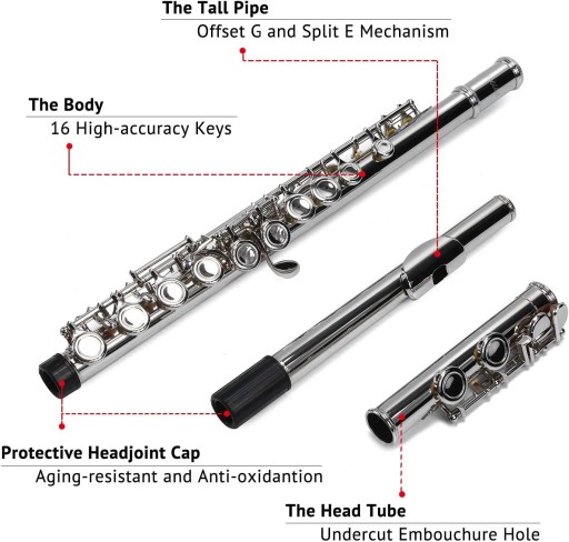- Najlepszy flet startowy – wysokiej jakości posrebrzany flet C z 16 przyciskami, zamkniętym otworem z odsadzonym przyciskiem G i dzielonym przyciskiem E, zdecydowanie dobry flet dla początkujących dla dzieci, studentów i dorosłych.