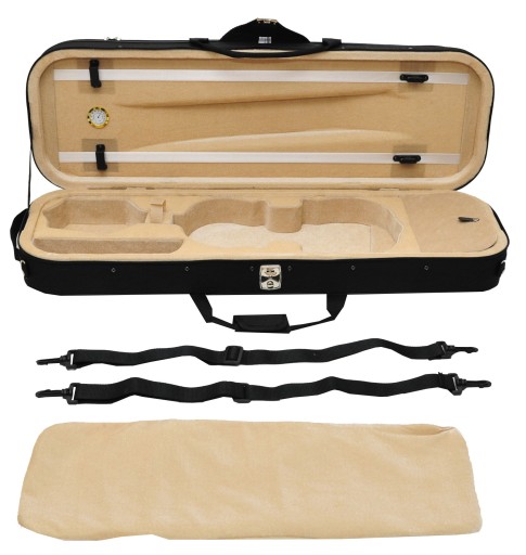 Znajdują się tam również dwa uchwyty na smyczki, zamykany praktyczny schowek na akcesoria oraz miękka tkanina do przykrywania skrzypiec.