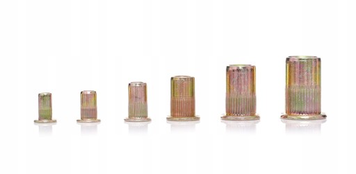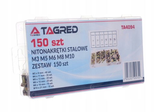 Stalowe nitonakrętki o rozmiarze M3 do M10. Posiadają kołnierz walcowy, radełkowany, dzięki czemu ściślej przylegają do mocowanego elementu. Nitonakrętki TAGRED umożliwiają wkręcenie wkręta bądź śruby z gwintem metrycznym w blachę lub inne materiały, tam gdzie nie ma możliwości wykonania gwintu.