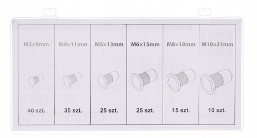 Nitonakrętki stalowe M3 M4 M5 M6 M8 M10 150 szt., w organizerze