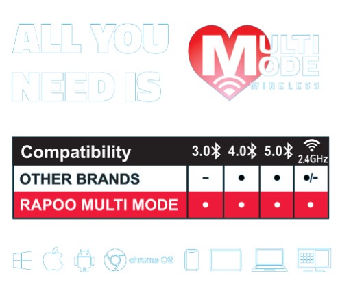 Mając na celu usprawnienie pracy profesjonalistów, technologia Multi-Mode Wireless firmy Rapoo zapewnia pełną kompatybilność i automatyczne parowanie. Niezależnie od tego, czy Twoje urządzenie obsługuje Bluetooth 3.0 lub wcześniejszy, Bluetooth 4.0 lub nowszy, czy chcesz połączyć się za pomocą adaptera Wi-Fi 2,4 GHz, możesz mieć pewność, że zestaw 8210M jest kompatybilny.