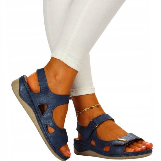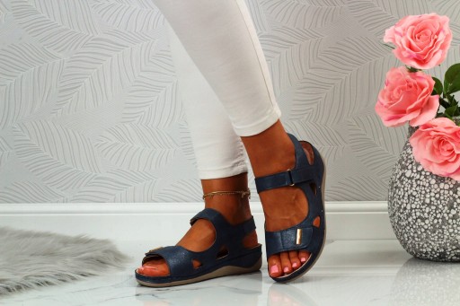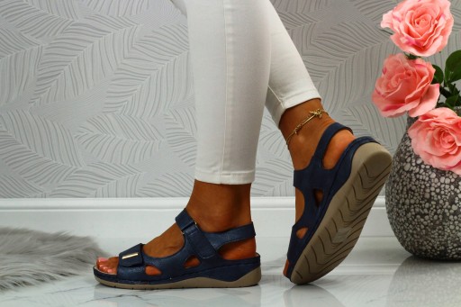 Damskie sandały w kolorze niebieskim na niskim koturnie. Idealnie sprawdzą się jako obuwie na co dzień w letnie, upalne dni. Paski na rzepy ułatwiają zakładanie obuwia oraz dopasowanie go do stopy. Profilowana, skórzana wkładka zapewnia komfort użytkowani a szyte spody zwiększają wytrzymałość obuwia.