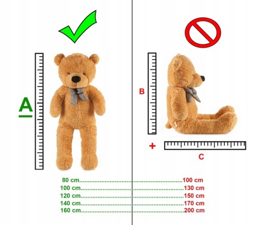 Kupując na naszych aukcjach płacisz za REALNE WYMIARY misia, którego mierzymy na stojąco. Na wielu innych aukcjach można spotkać zawyżone rozmiary misiów o 20-30 cm co próbuje się tłumaczyć mierzeniem misia "na siedząco", jak na rysunku obok.