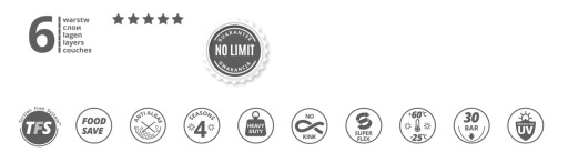 6 warstw – warstwa wewnętrzna wyprodukowana z surowców przeznaczonych do kontaktu z żywnością, czarna dusza, oplot krzyżowy trykotowy wykonany z najwyższej jakości przędzy poliestrowej, czarna oblewka, oplot trykotowy z najwyższej jakości przędzy poliestrowej, kryjąca oblewka.
