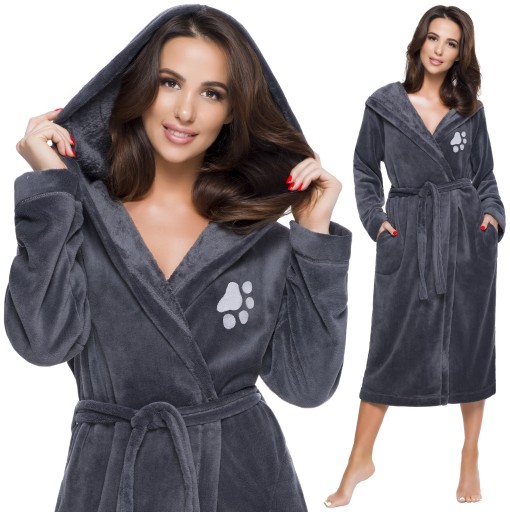Dla miłośników zwierząt, szlafrok z haftem psiej łapki - na wysokości biustu.