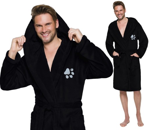 Szlafrok męski z kapturem, wiązany w pasie, z miękkiej dzianiny (soft), na biodrach kieszenie zewnętrzne, na wysokości klatki piersiowej haft - psiał łapka.