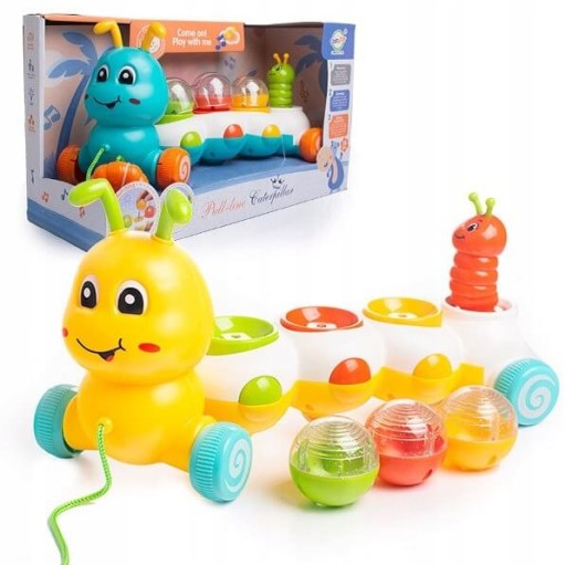 - Funkcja edukacyjna: sorter kształtów z kolorowymi kuleczkami do dopasowania na grzbiecie gąsienicy, wspierająca rozwój umiejętności motorycznych.