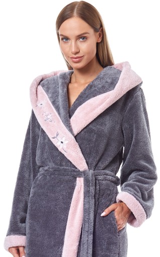 Długi szlafrok w stonowanych kolorach z kapturem, z kontrastową lamówką i pięknym haftem.