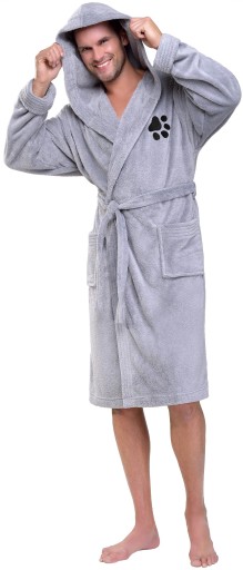 Szlafrok męski z kapturem, wiązany w pasie, z miękkiej dzianiny (soft), na biodrach kieszenie zewnętrzne, na wysokości klatki piersiowej haft - ŁAPKA. Miły i przyjemny w dotyku, gwarantuje komfort noszenia.