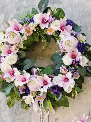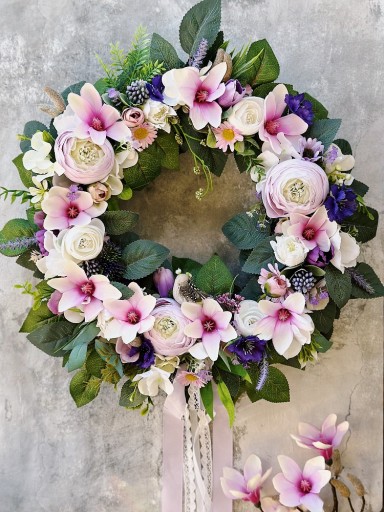 Wianek wiosenny, ozdobiony sztucznymi kwiatami magnolii, pełników, hortensji oraz różnorodnymi dodatkami, liśćmi i kokardką.