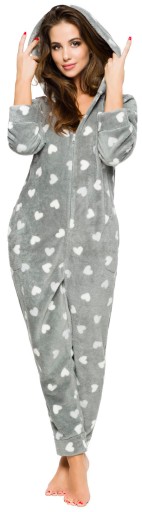 Miły kombinezon z kapturem. Zapinany na zamek. Piżama z praktycznymi kieszeniami. Całość w serduszka.