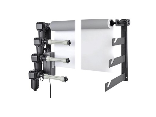 ◇ Elektryczny system mocowania tła umożliwia jego łatwe zawieszenie na ścianie, statywie lub suficie. Dzięki specjalnym mechanizmom tło można zamontować na kartonowej lub innego rodzaju tulei (tuleje nie są dołączone do zestawu), zapewniając stabilne połączenie z systemem zawieszania. Pokrętła umieszczone po bokach działają poprzez mechanizm kołków rozprężnych, które integrują je z systemem zawieszania. Sterowanie odwijaniem i nawijaniem tła odbywa się za pomocą zdalnie sterowanego napędu, co pozwala na precyzyjną regulację szerokości.
