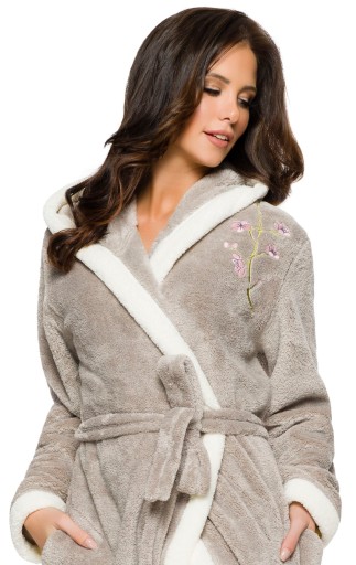 Długi szlafrok w stonowanych kolorach z kapturem, z kontrastową lamówką. Przy ramieniu piękny haft.