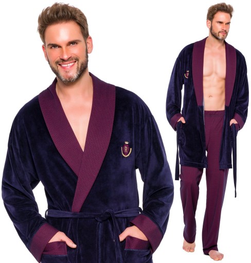 Szlafrok męski z kołnierzem, wiązany w pasie, z miękkiego weluru, na biodrach kieszenie zewnętrzne, na wysokości klatki piersiowej haft.