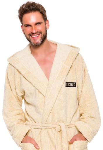 Szlafrok męski z kapturem, wiązany w pasie, z miękkiej dzianiny (soft), na biodrach kieszenie zewnętrzne, na wysokości klatki piersiowej naszyta aplikacja.