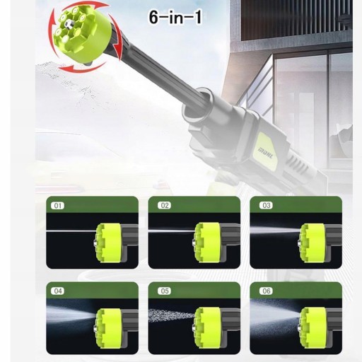 Myjka wysokociśnieniowa posiada regulowaną dyszę 6w1(0° ,15°, 25°, 40°, wiele strumieni, impulsowo). Nie trzeba wymieniać dysz aby zmienić rodzaj strumienia, wystarczy delikatnie przekręcić dyszę, aby przełączać się między 6 trybami strumienia. Moc czyszczenia wzrasta wraz z mniejszym kątem strumienia.