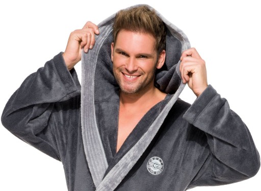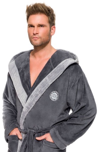 Szlafrok męski z kapturem, wiązany w pasie, z miękkiej dzianiny (soft), na biodrach kieszenie zewnętrzne, na wysokości klatki piersiowej naszyta aplikacja. Miły i przyjemny w dotyku, gwarantuje komfort noszenia.
