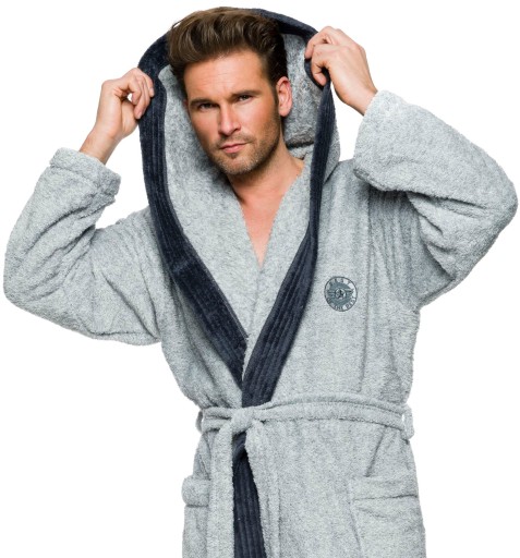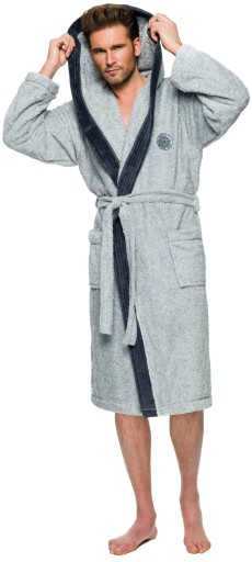 Szlafrok męski z kapturem, wiązany w pasie, z miękkiej dzianiny (soft), na biodrach kieszenie zewnętrzne, na wysokości klatki piersiowej naszyta aplikacja. Miły i przyjemny w dotyku, gwarantuje komfort noszenia.