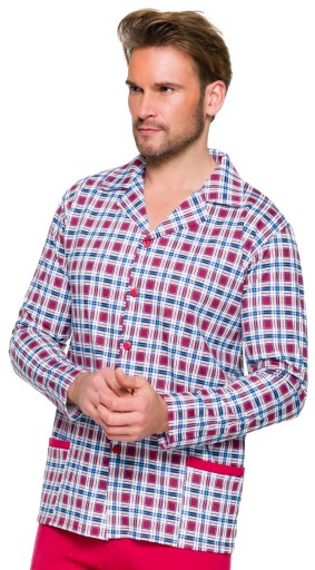 Klasyczna piżama męska złożona z bluzki w kratkę, rozpinanej po całości, zestawionej z jednolitymi spodniami z gładkiej dzianiny. Bluzka z kołnierzykiem, posiada dwie praktyczne kieszonki.
