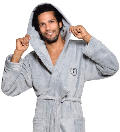 Szlafrok męski z kapturem, wiązany w pasie, z miękkiej dzianiny (soft), na biodrach kieszenie zewnętrzne, na wysokości klatki piersiowej naszyta aplikacja. Miły i przyjemny w dotyku, gwarantuje komfort noszenia.