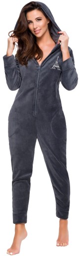 Miły kombinezon z kapturem. Zapinany na zamek. Piżama z praktycznymi kieszeniami. Całość gładka, na piersi haft wieża Eiffla.