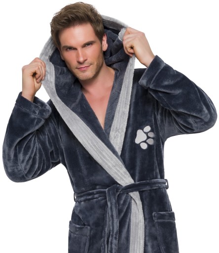 Szlafrok męski z kapturem, wiązany w pasie, z miękkiej dzianiny (soft), na biodrach kieszenie zewnętrzne, na wysokości klatki piersiowej naszyta aplikacja. Miły i przyjemny w dotyku, gwarantuje komfort noszenia.