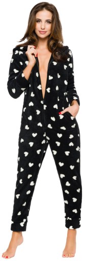 Miły kombinezon z kapturem. Zapinany na zamek. Piżama z praktycznymi kieszeniami. Całość w serduszka.