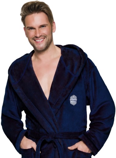 Szlafrok męski z kapturem, wiązany w pasie, z miękkiej dzianiny (soft), na biodrach kieszenie zewnętrzne, na wysokości klatki piersiowej naszyta aplikacja.