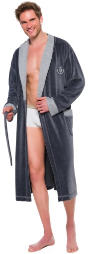 Szlafrok męski z kołnierzem, wiązany w pasie, z miękkiego weluru, na biodrach kieszenie zewnętrzne, na wysokości klatki piersiowej haft.
