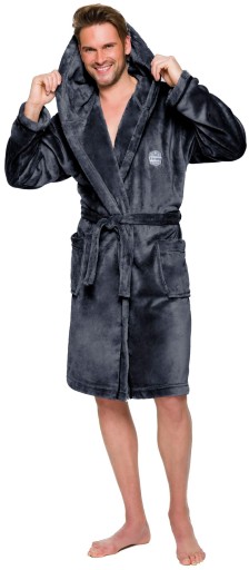 Szlafrok męski z kapturem, wiązany w pasie, z miękkiej dzianiny (soft), na biodrach kieszenie zewnętrzne, na wysokości klatki piersiowej naszyta aplikacja.