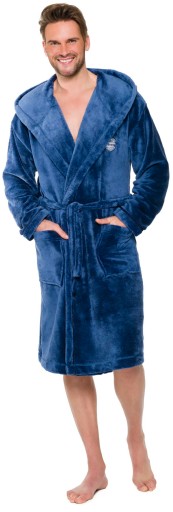 Szlafrok męski z kapturem, wiązany w pasie, z miękkiej dzianiny (soft), na biodrach kieszenie zewnętrzne, na wysokości klatki piersiowej naszyta aplikacja.