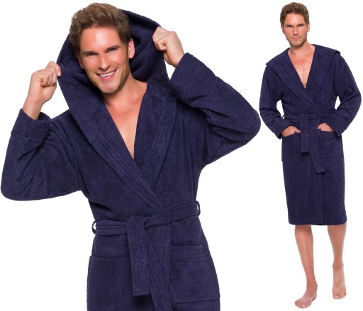 Szlafrok męski z kapturem, wiązany w pasie, z miękkiej bawełny, na biodrach kieszenie zewnętrzne, na wysokości klatki piersiowej haft. Miły i przyjemny w dotyku, gwarantuje komfort noszenia.