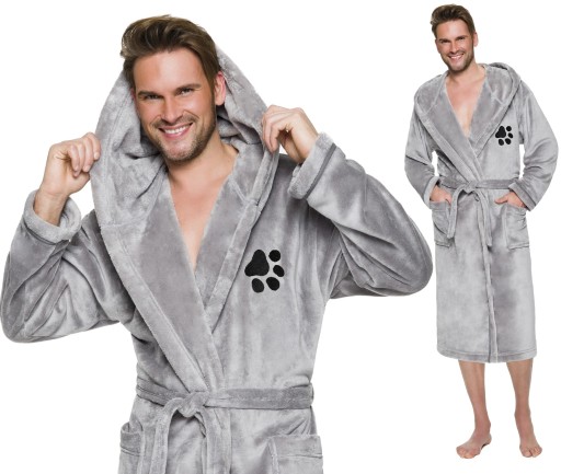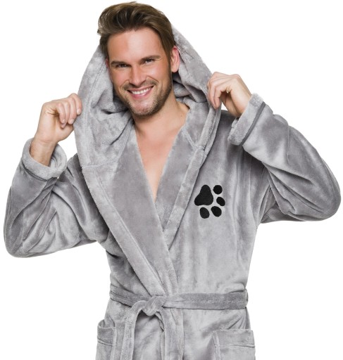 Szlafrok męski z kapturem, wiązany w pasie, z miękkiej dzianiny (soft), na biodrach kieszenie zewnętrzne, na wysokości klatki piersiowej haft - psiał łapka.