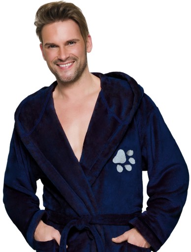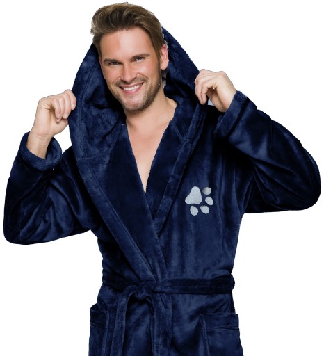 Szlafrok męski z kapturem, wiązany w pasie, z miękkiej dzianiny (soft), na biodrach kieszenie zewnętrzne, na wysokości klatki piersiowej haft - psiał łapka.