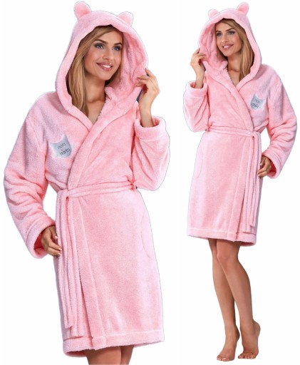 Krótki szlafrok w stonowanych kolorach - kaptur z uroczymi uszami. Na wysokości piersi haftowana aplikacja.