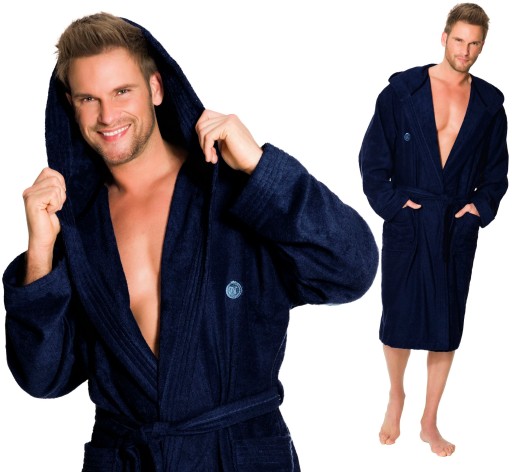 Szlafrok męski z kapturem, wiązany w pasie, z bawełny BAMBUS, na biodrach kieszenie zewnętrzne, na wysokości klatki piersiowej naszyta aplikacja. Miły i przyjemny w dotyku, gwarantuje komfort noszenia.