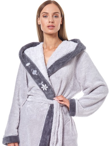 Długi szlafrok w stonowanych kolorach z kapturem, z kontrastową lamówką i pięknym haftem.