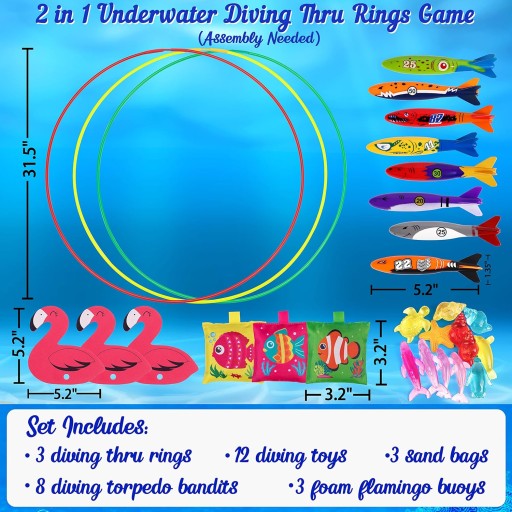 Zestaw zabawek do basenu - Razem to 25 sztuk. W zestawie 3 pierścienie do kąpieli, 8 torpedowych bandytów, 8 klejnotów do nurkowania, 3 boje flamingo, 3 worki z piaskiem. Pierścienie są składane dla łatwego przechowywania i wymagają ustawienia za pomocą dołączonych instrukcji.