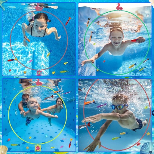 Dobre rozmiary zabawek wodnych na małe ręce- Pierścień nurkowy: 31,5 cala. Boja Flamingo: 5.2”x5.2.” Bandyci topedo: 1.35” 5,2 cala”. Klejnot: 0,8” – 0,8”. Torba z piaskiem: 3,2 cala. Są bardzo jasne w kolorach, co sprawia, że dzieci są łatwe do wykrycia podczas pływania pod wodą. Składne pierścienie ułatwiają przechowywanie.