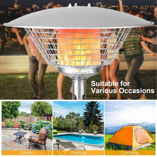 Wiele Zabezpieczeń Bezpieczeństwa: Ten grzejnik patio z funkcją zabezpieczenia przed przewróceniem automatycznie się wyłączy, gdy przechyli się o 45 stopni, co pomaga skutecznie zapobiec potencjalnym niebezpieczeństwom. Dzięki ochronie przed zgaszeniem ognia, możesz cieszyć się ciepłem w ostatecznym bezpieczeństwie. Efektywne i Szybkie Ogrzewanie: Ten wszechstronny grzejnik patio z 2 ustawieniami ciepła pozwala wybrać odpowiedni poziom według potrzeb. Wydajność cieplna wynosi aż 11 000 BTU, a promień ogrzewania wynosi 1,37 m. Bez względu na to, czy jesteś w ogrodzie, na tarasie czy w restauracji na patio, zawsze będzie Ci ciepło wokół.