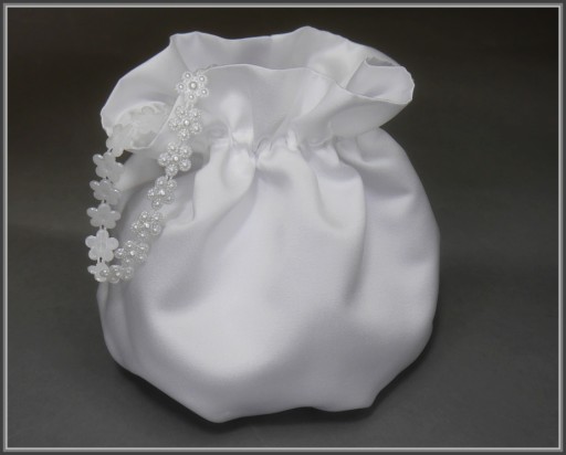 Torebka komunijna w kształcie woreczka. Wykonana z satyny ślubnej pierwszego gatunku. Torebka posiada usztywnianą wkładkę pomagającą w zachowaniu jej kształtu nawet po obciążeniu. Na pozostałych aukcjach można do niej dopasować: rękawiczki, okapnik czy wianek.