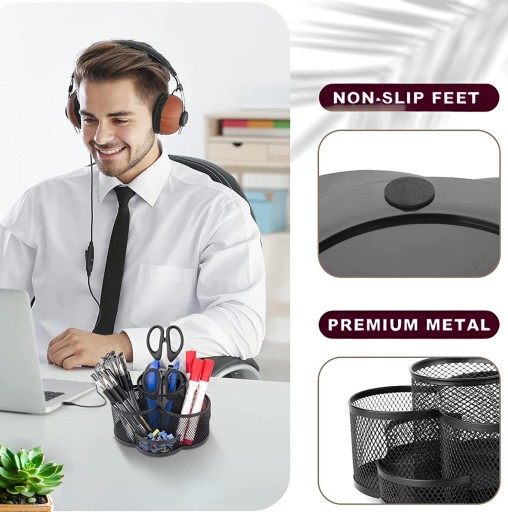 - materiał - przybornik wykonany jest z metalowej siatki z antypoślizgowymi nóżkami. Gładki krawędzie nadają mu eleganckiego wyglądu oraz sprawiają, że organizer idealnie wkomponuje się w każde biurko.