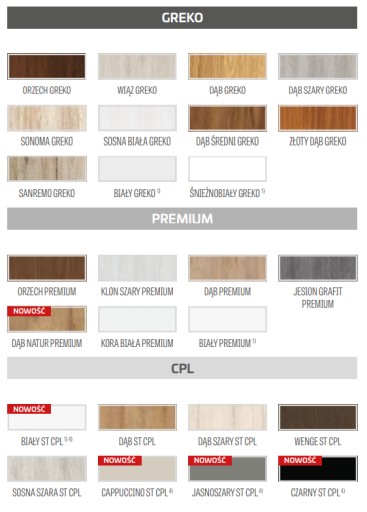 - Kolory Orzech, złoty dąb, sanremo, dąb, dąb szary, biały, biały greko, wiąz, dąb średni, sosna biała, sonoma