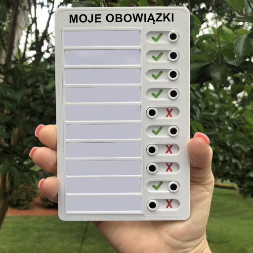 ➡️Przygotowanie listy jest niezwykle proste, wystarczy na kartce dołączonej do zestawu wpisać dowolne obowiązki lub przygotować taką listę na komputerze i wydrukować. Następnie demontujemy ramkę, umieszczamy tam karteczkę i montujemy ją ponownie. Wymiary karteczki: 6,8 cm x 17 cm.